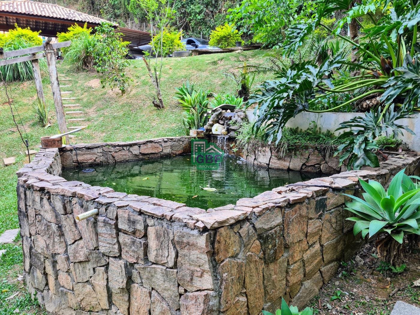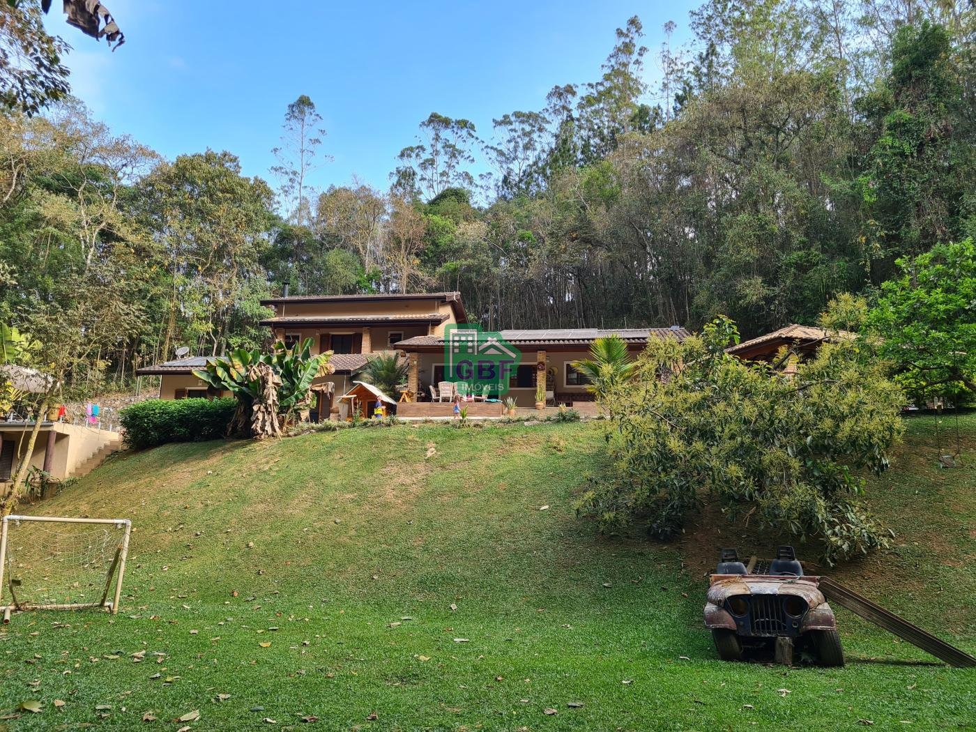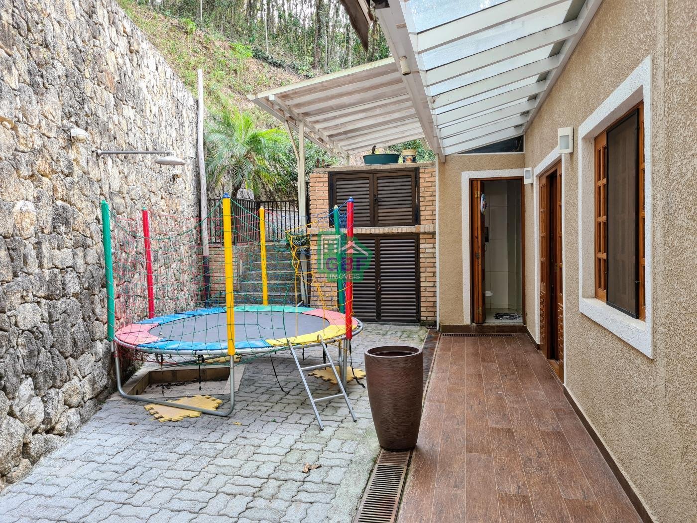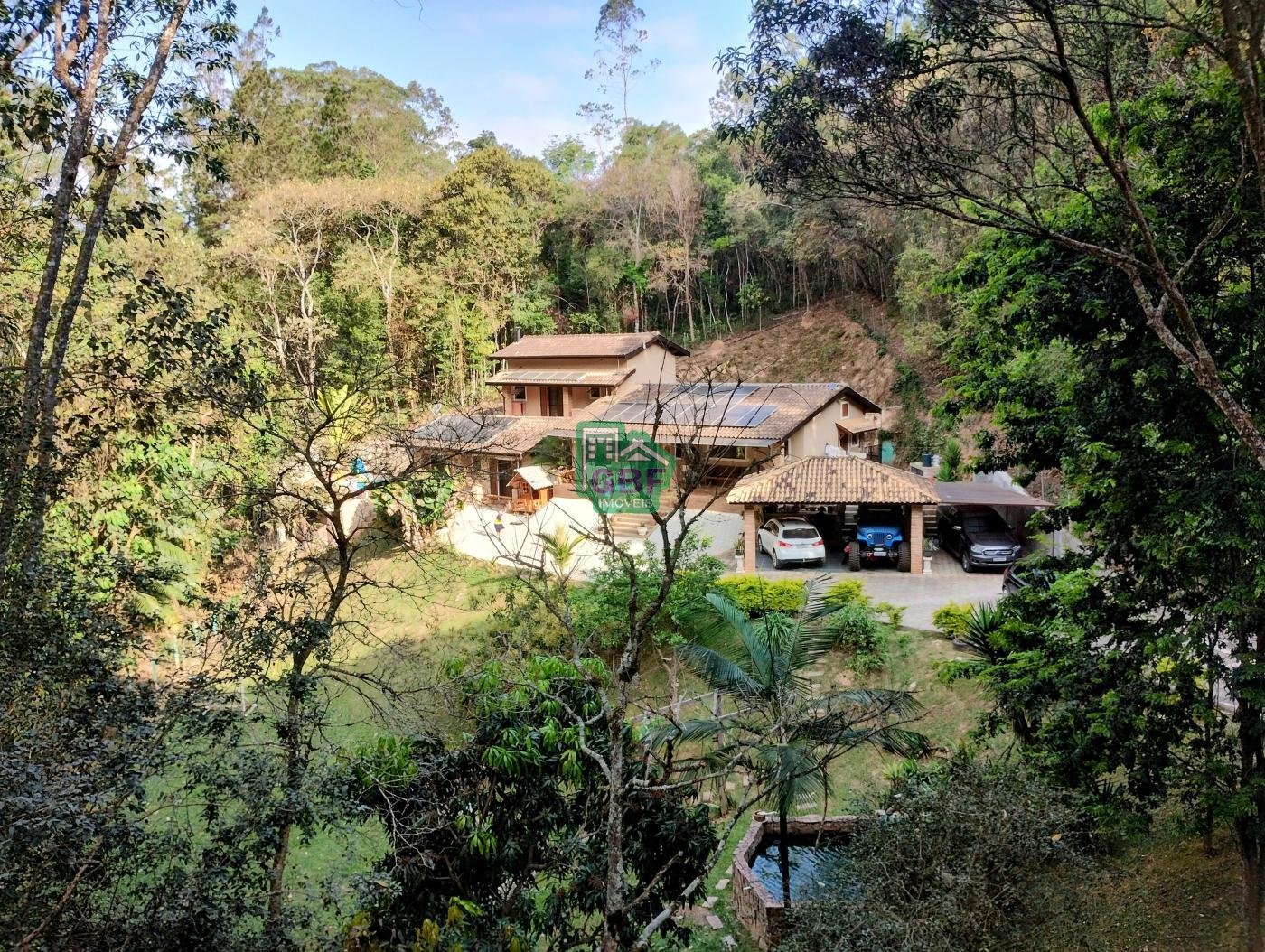 Área externa com piscina de fibra, espaço gourmet com churrasqueira, deck com vista para a mata, banheiro social, gramado, cascata, playground, galinheiro, portão automático, infraestrutura com aquecimento solar e garagem coberta com 3 vagas.