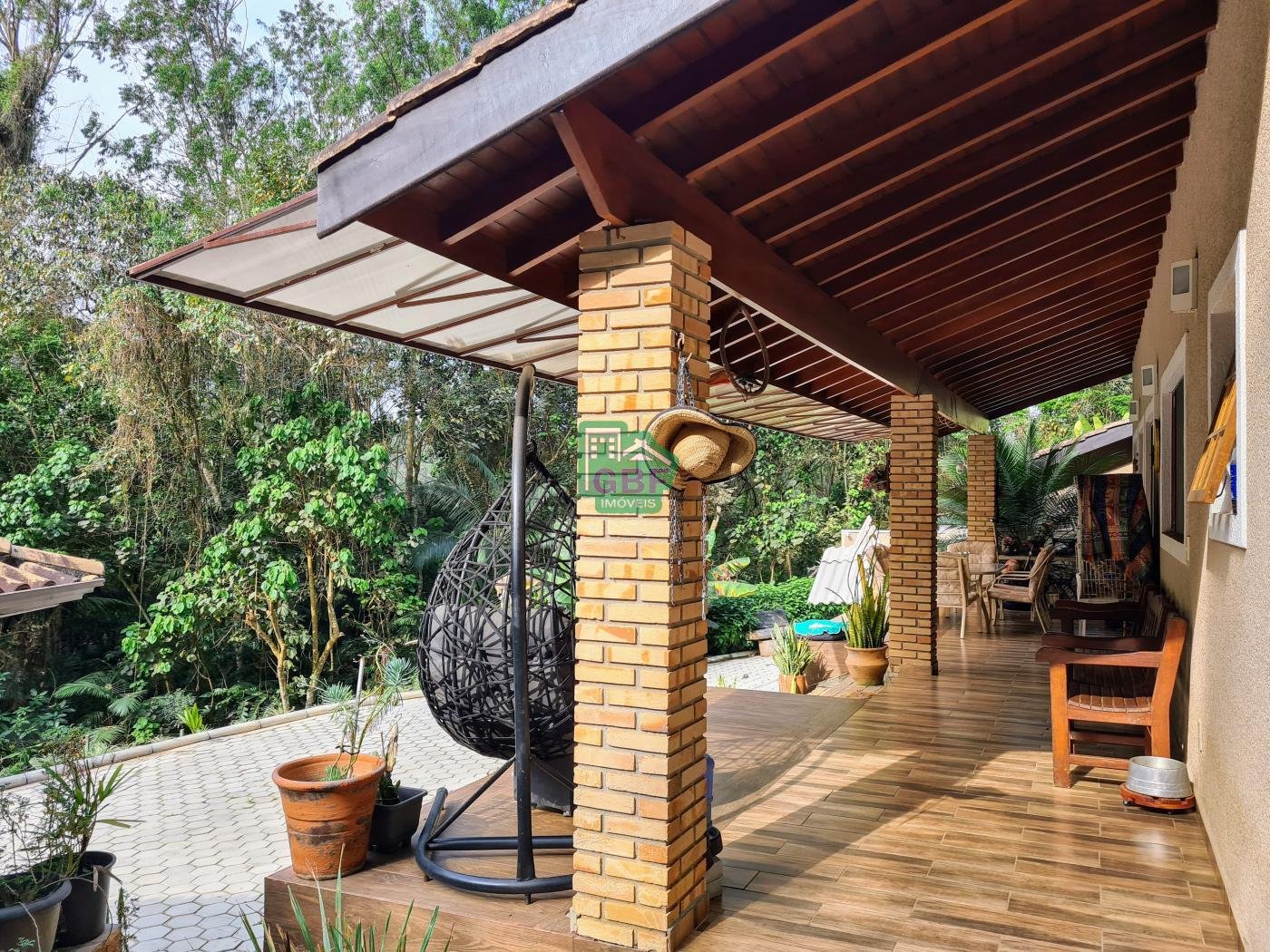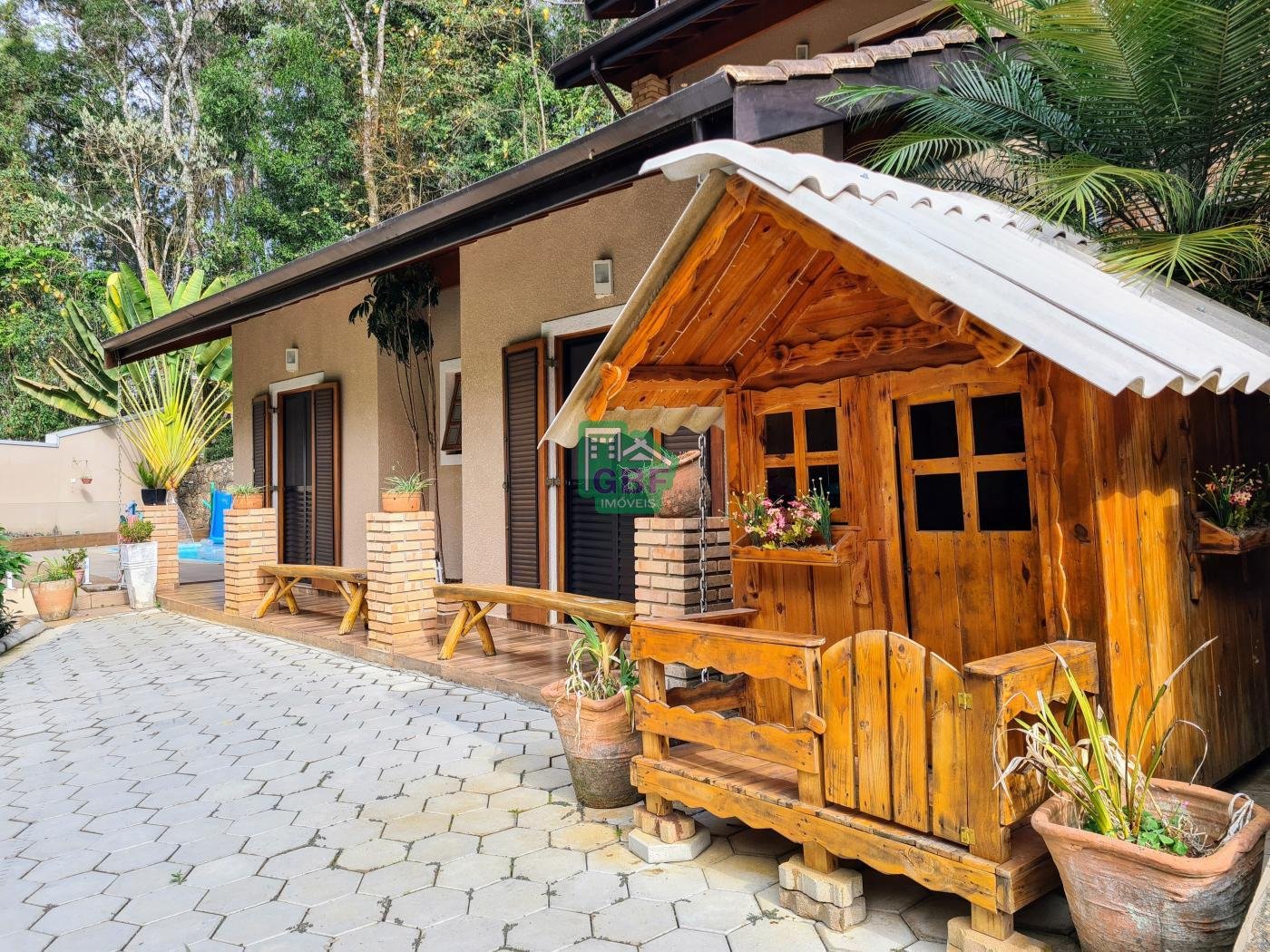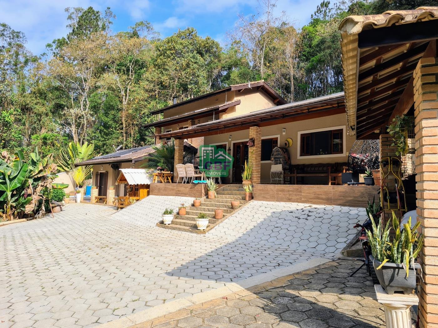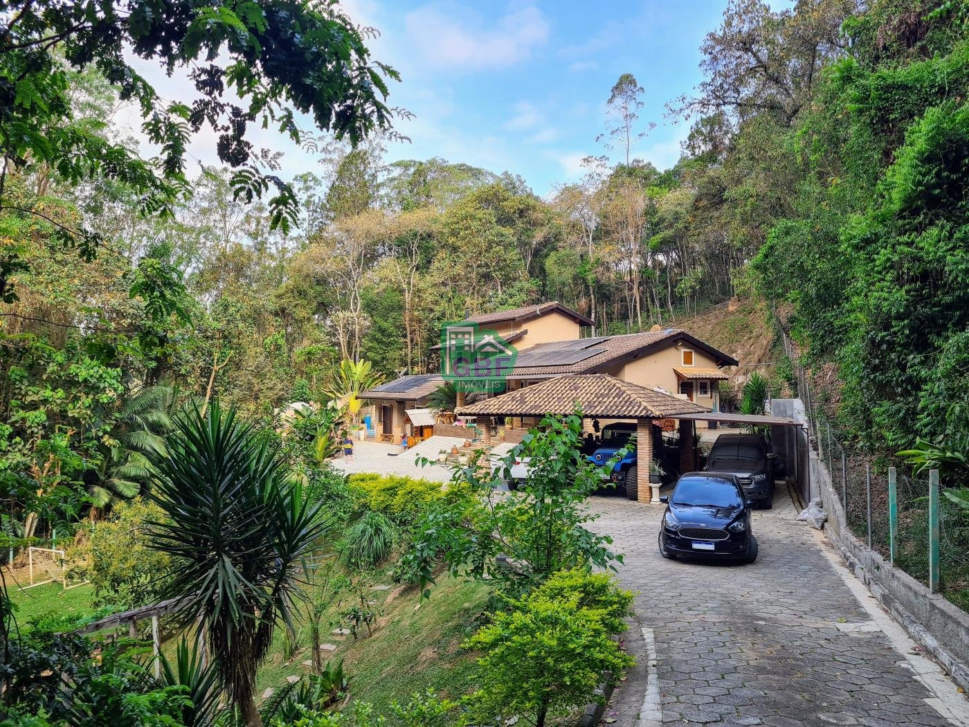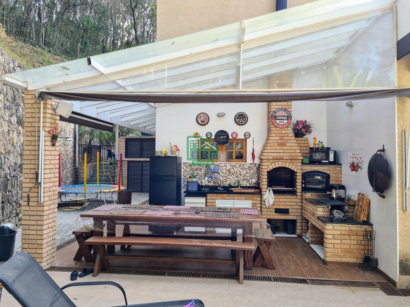 Área externa com piscina de fibra, espaço gourmet com churrasqueira, deck com vista para a mata, banheiro social, gramado, cascata, playground, galinheiro, portão automático, infraestrutura com aquecimento solar e garagem coberta com 3 vagas.