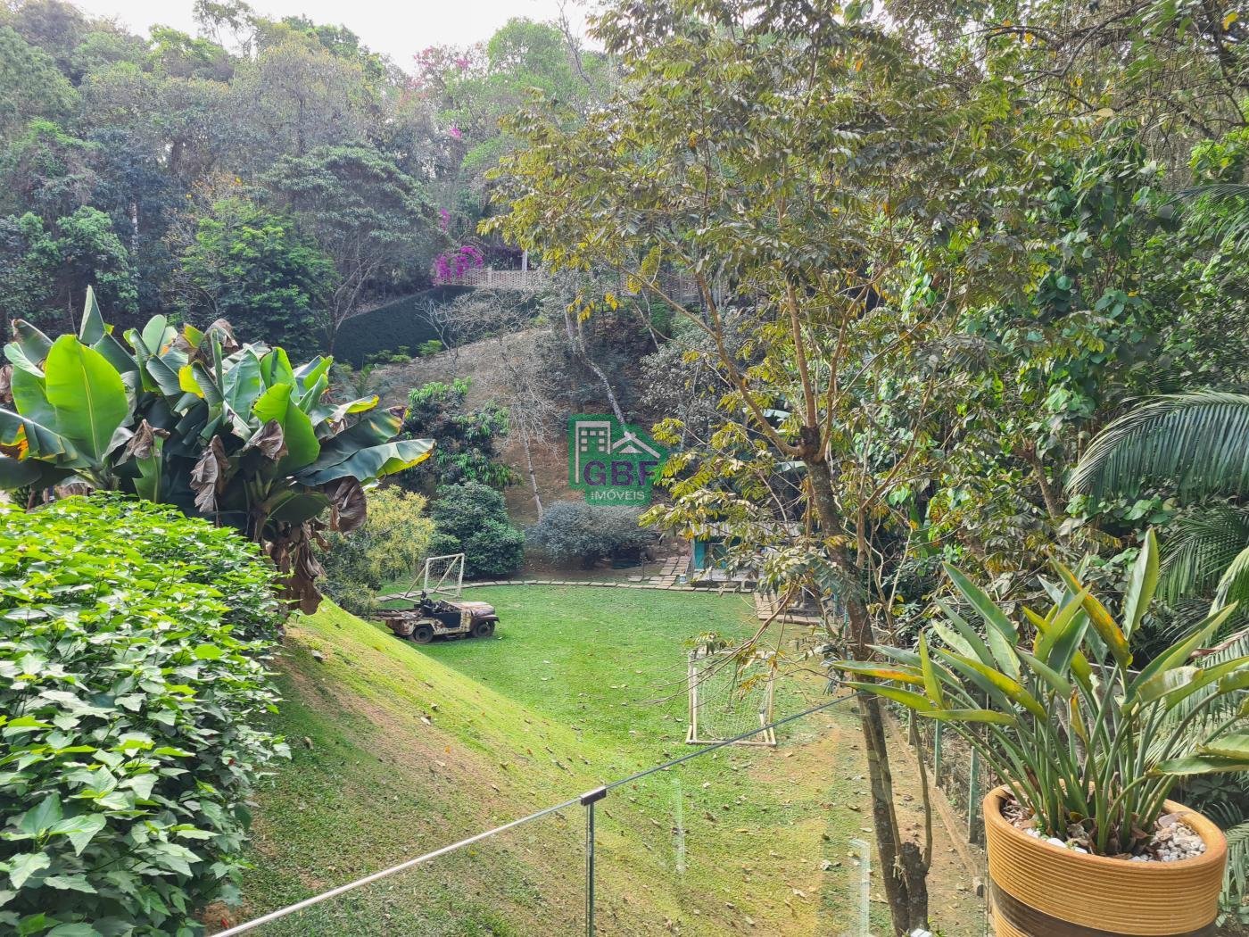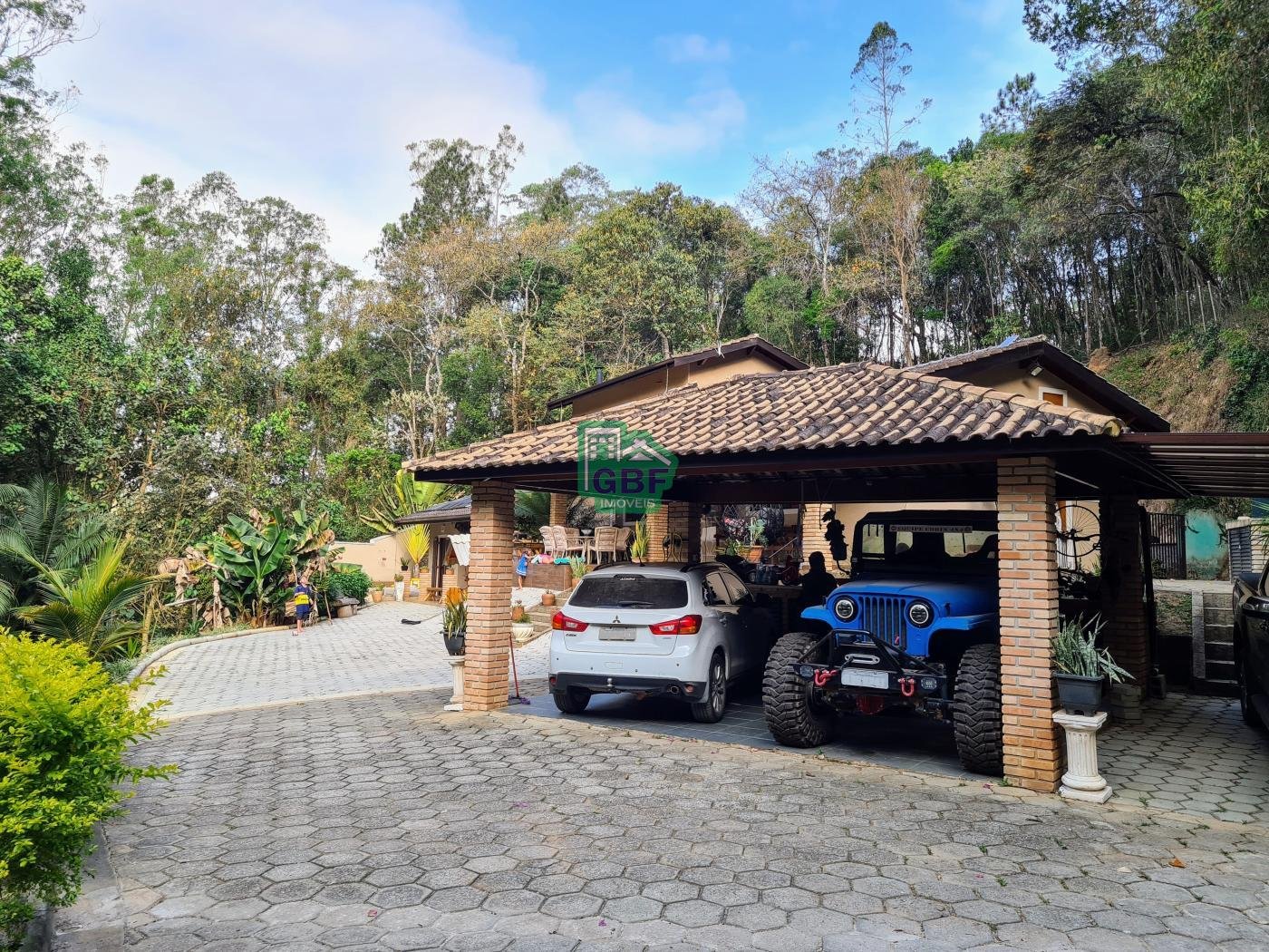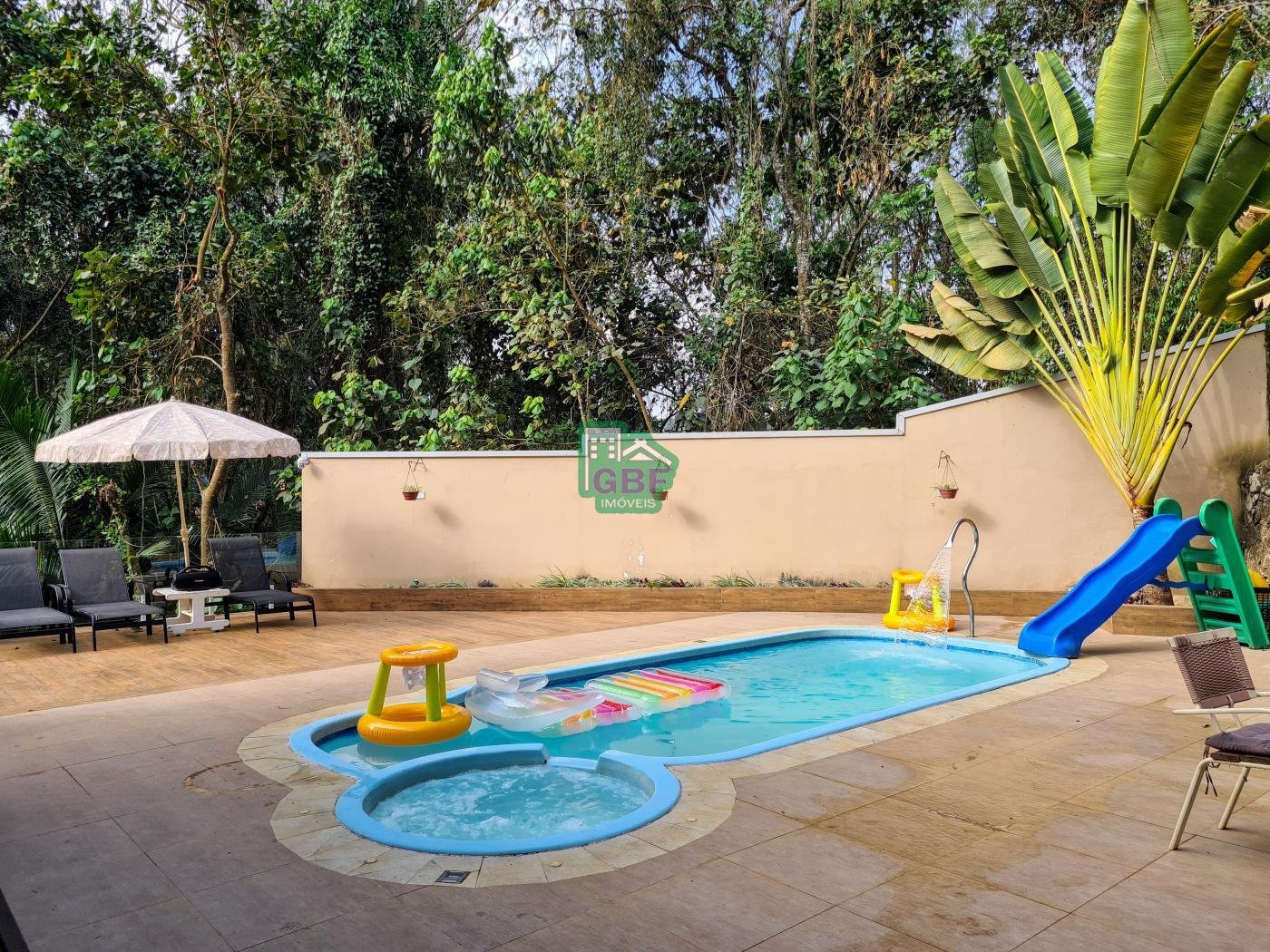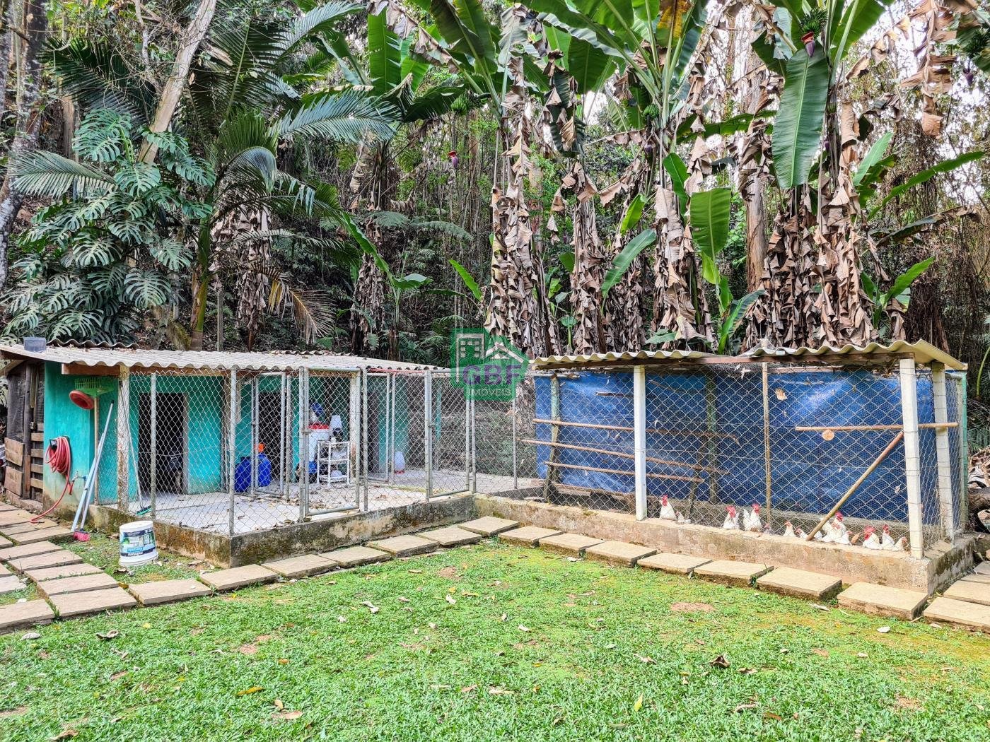 Área externa com piscina de fibra, espaço gourmet com churrasqueira, deck com vista para a mata, banheiro social, gramado, cascata, playground, galinheiro, portão automático, infraestrutura com aquecimento solar e garagem coberta com 3 vagas.