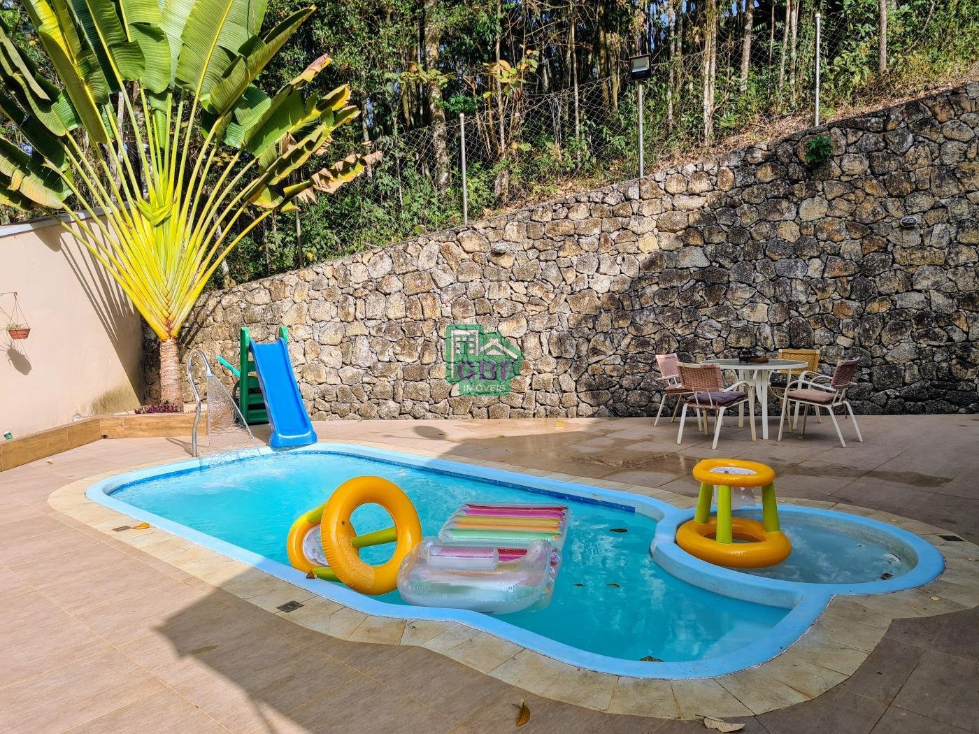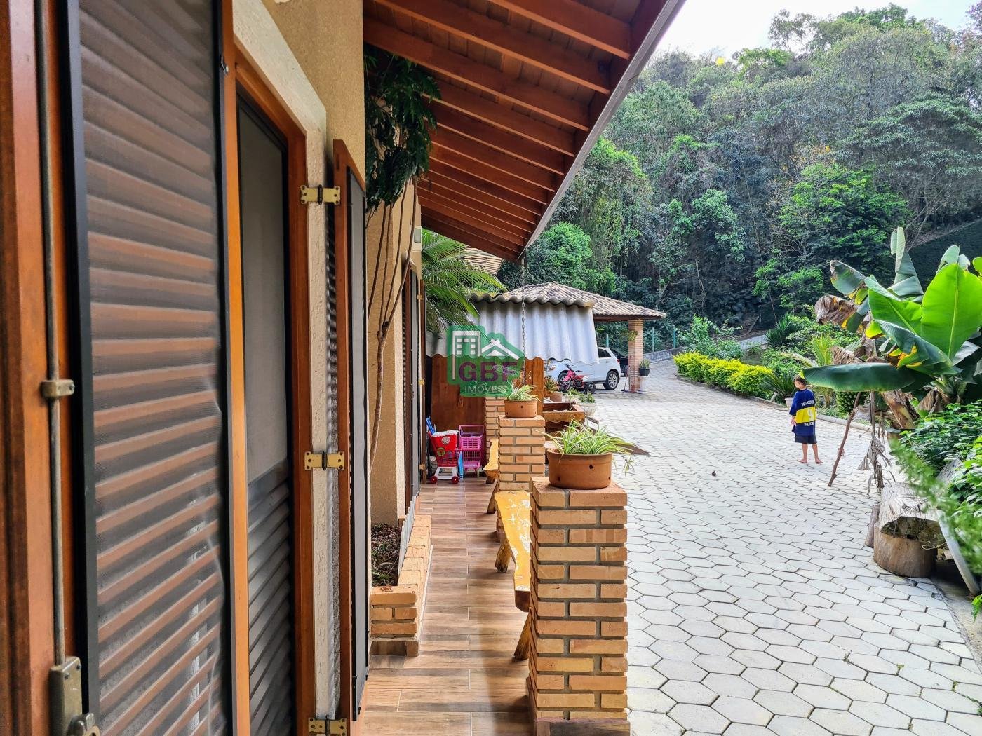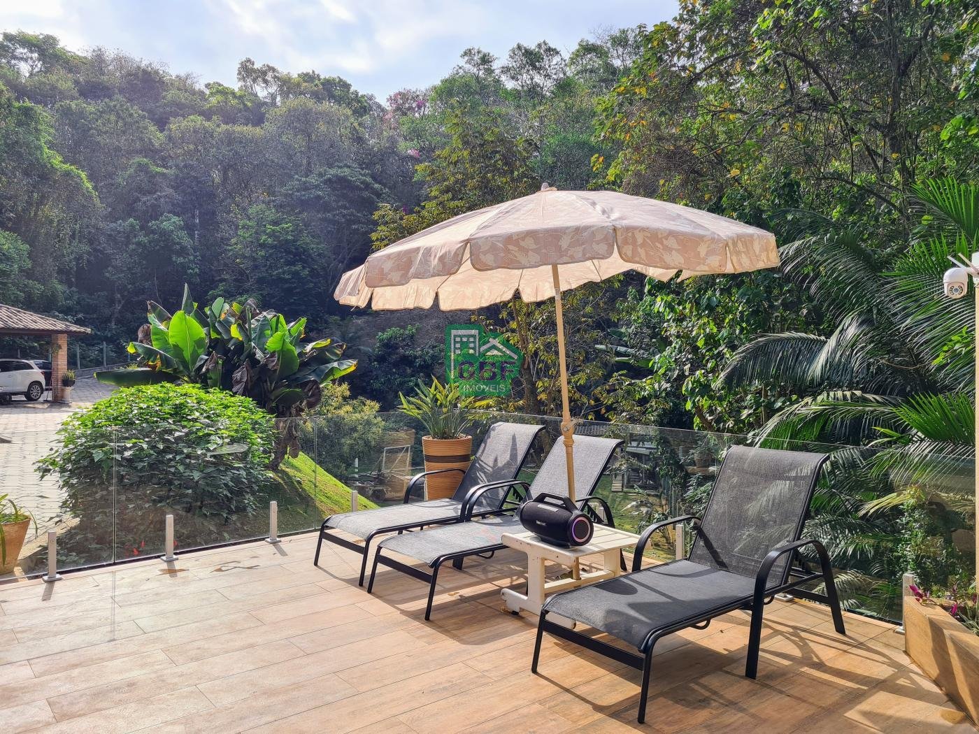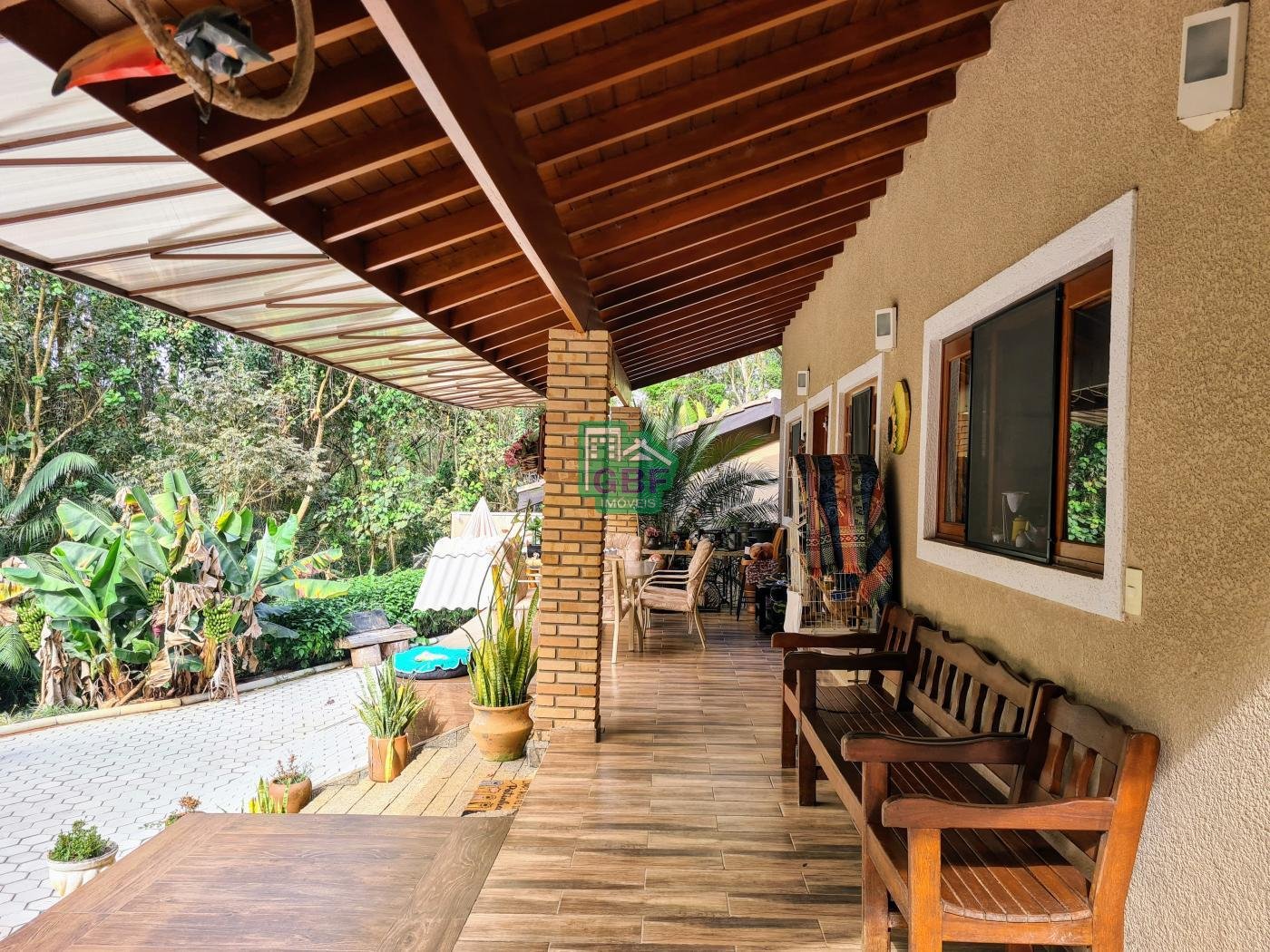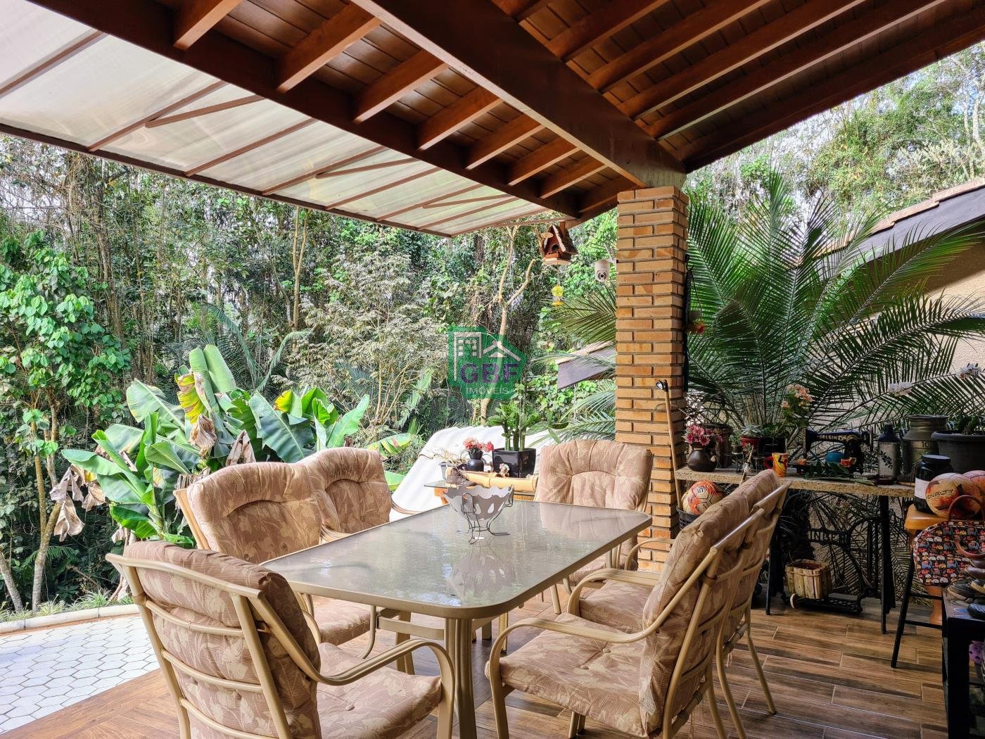 Área externa com piscina de fibra, espaço gourmet com churrasqueira, deck com vista para a mata, banheiro social, gramado, cascata, playground, galinheiro, portão automático, infraestrutura com aquecimento solar e garagem coberta com 3 vagas.