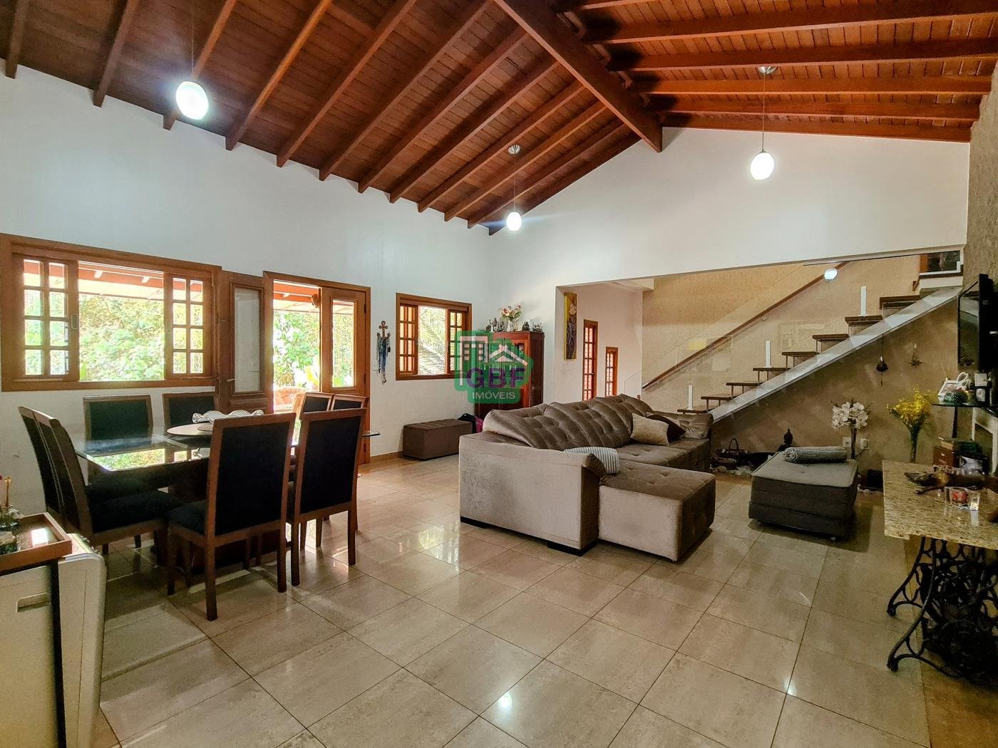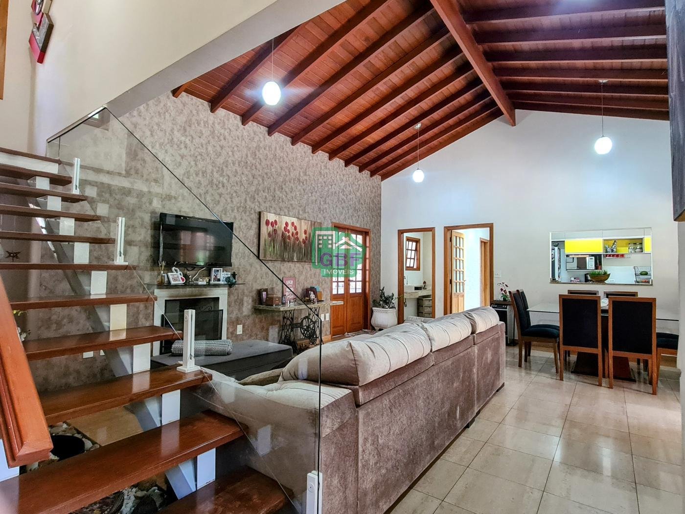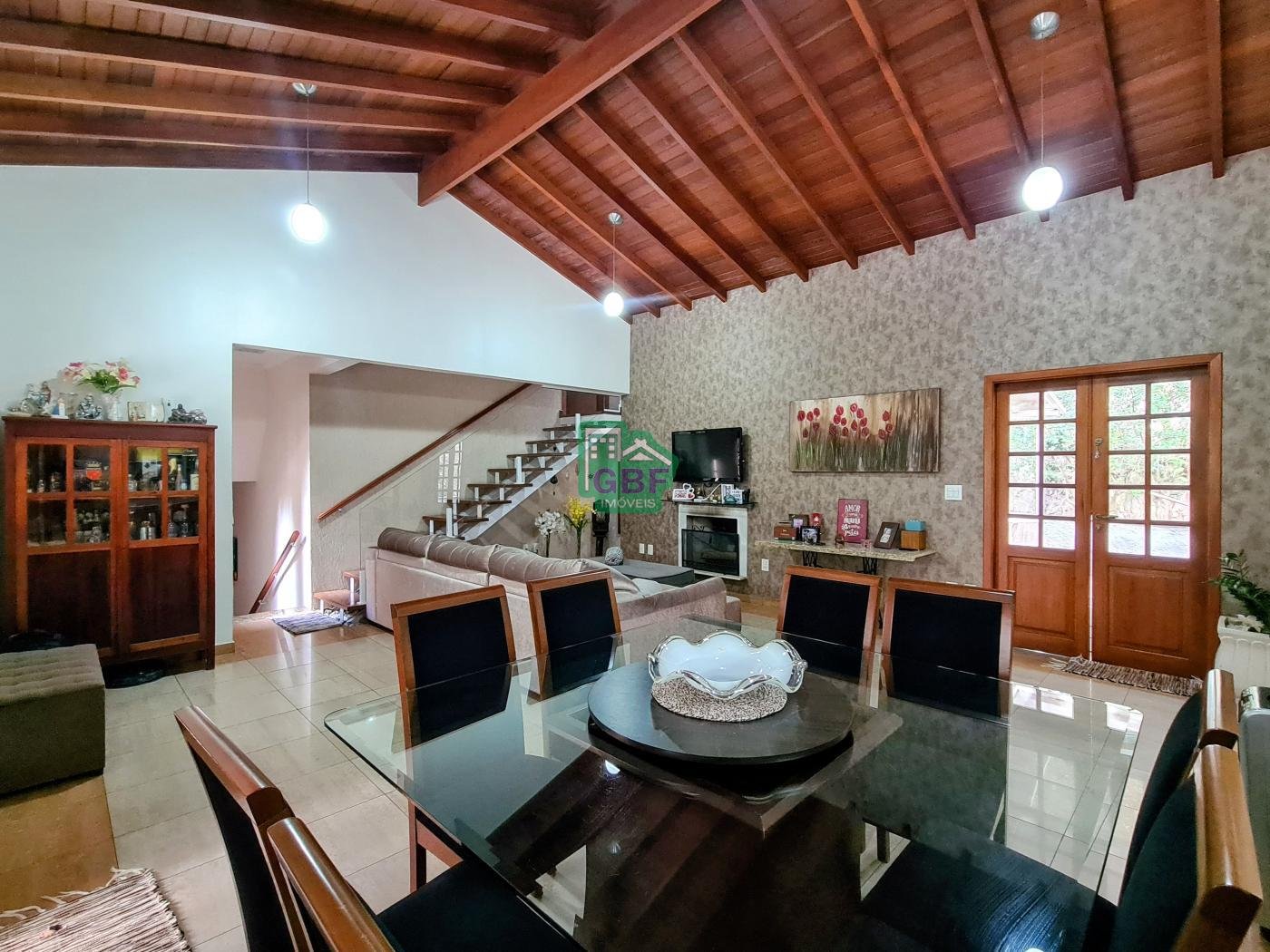 A casa é composta por 3 dormitórios sendo 1 suíte com closet e sacada, sala de 2 ambientes com lareira, sala de TV,